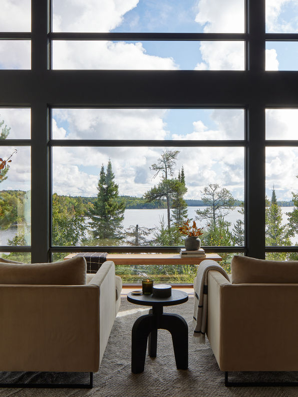 Our intention for our Luxury Lakehouse project was to create a contemporary cabin that felt warm, and inviting and incorporated the client’s love of natural materials. The biggest inspiration for the design of this cabin was its stunning views. For this project, there was a strong focus on creating the perfect space to host family and friends. This elevated guest experience can be seen throughout the cabin, from the spacious and comfortable main floor to the lower level which features unique theme rooms and games areas.